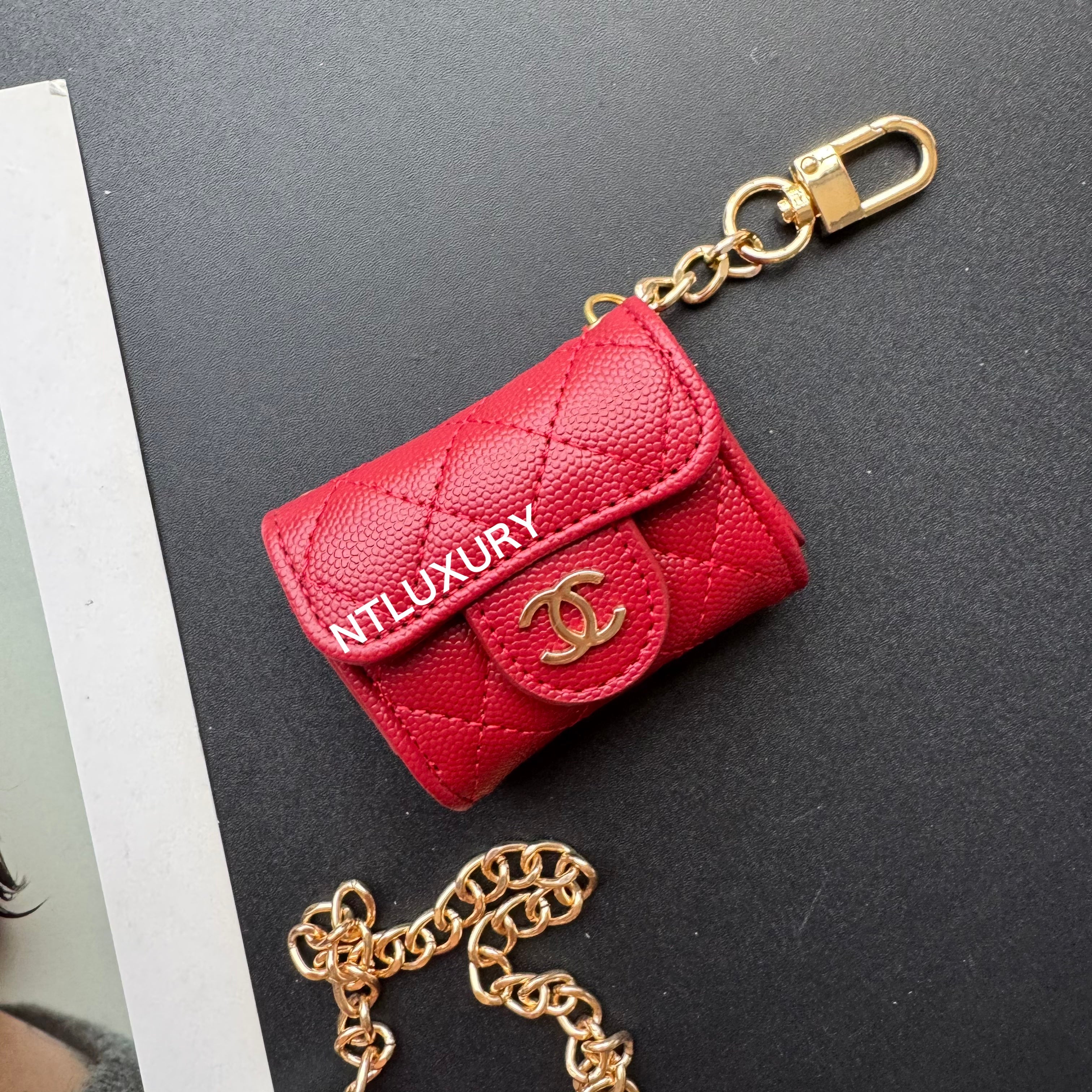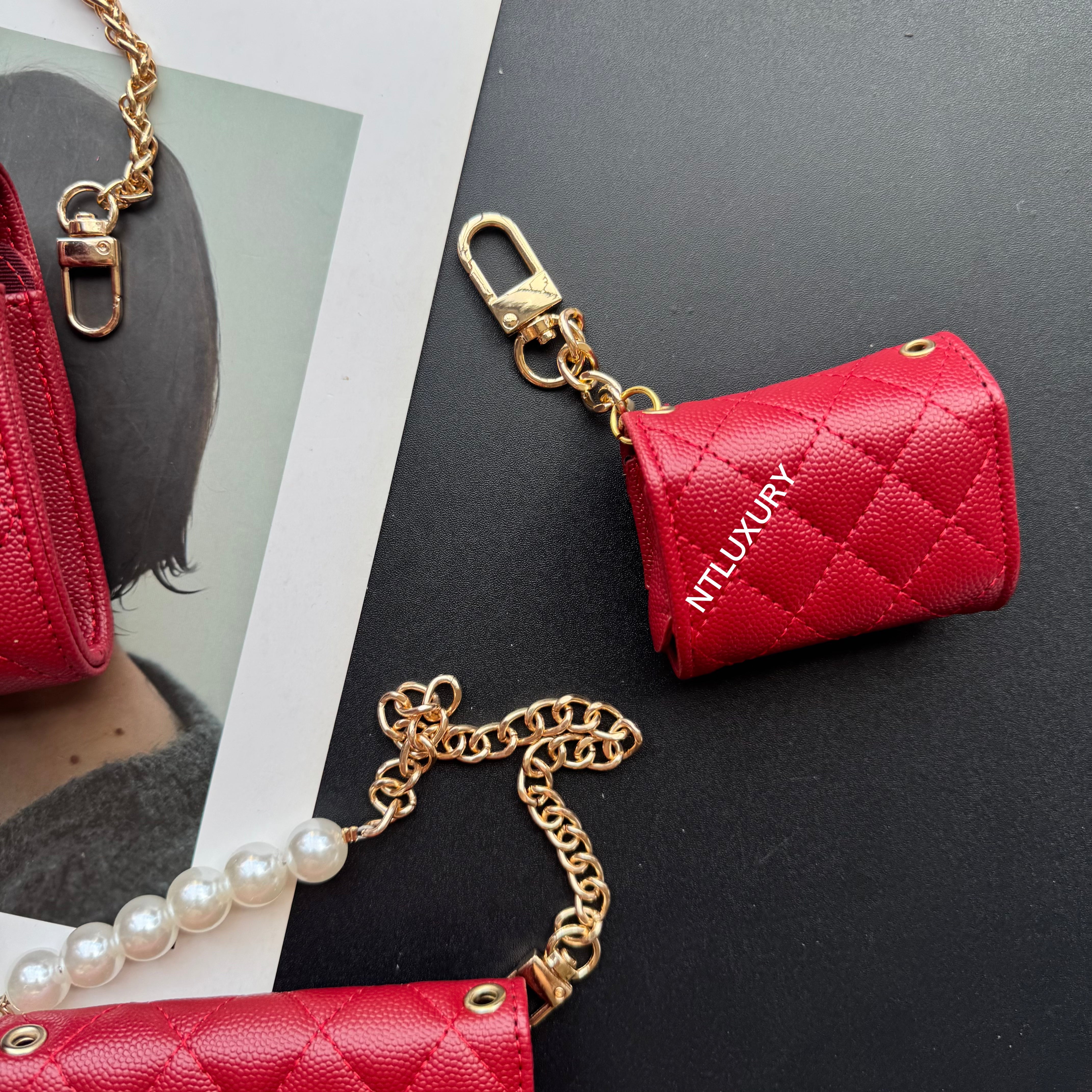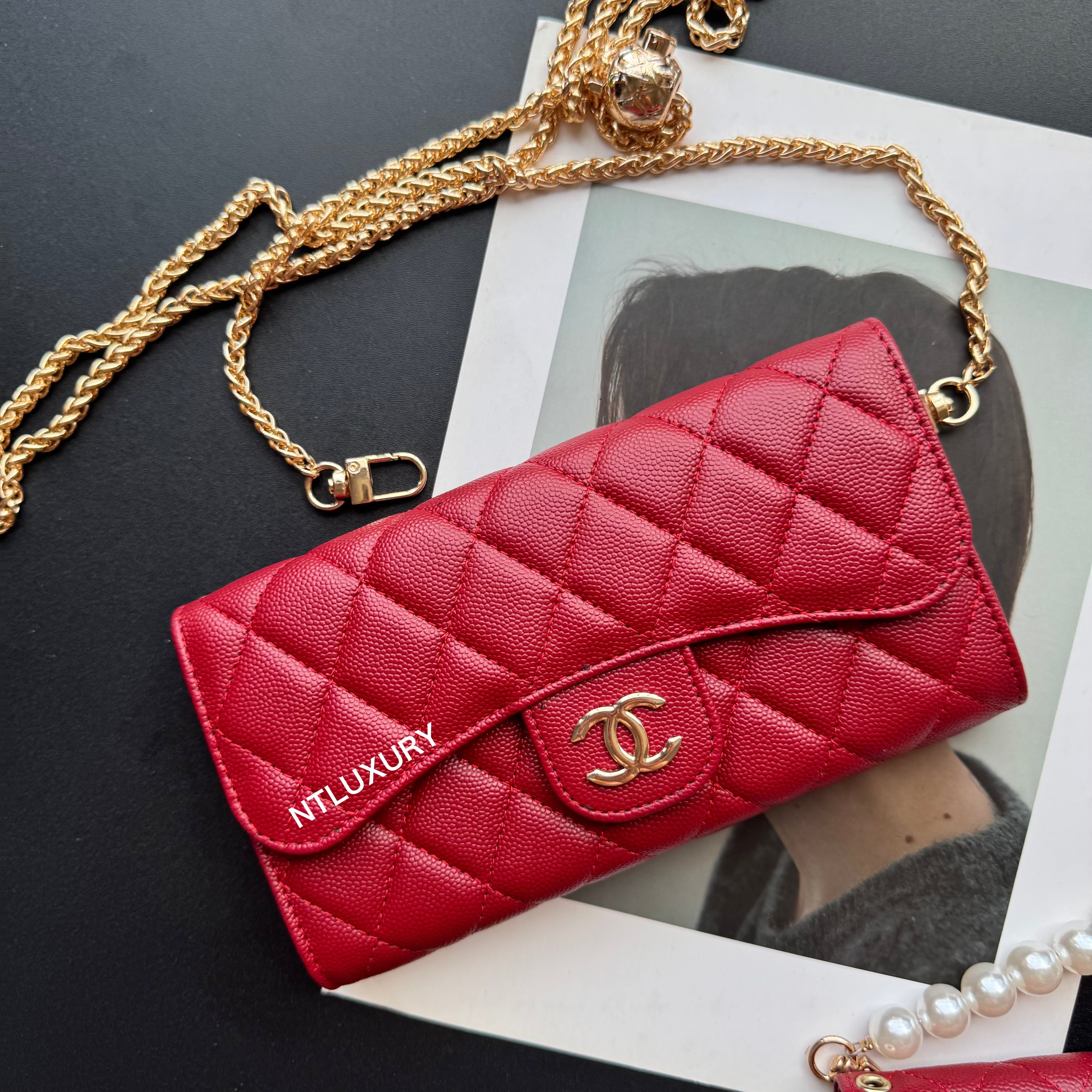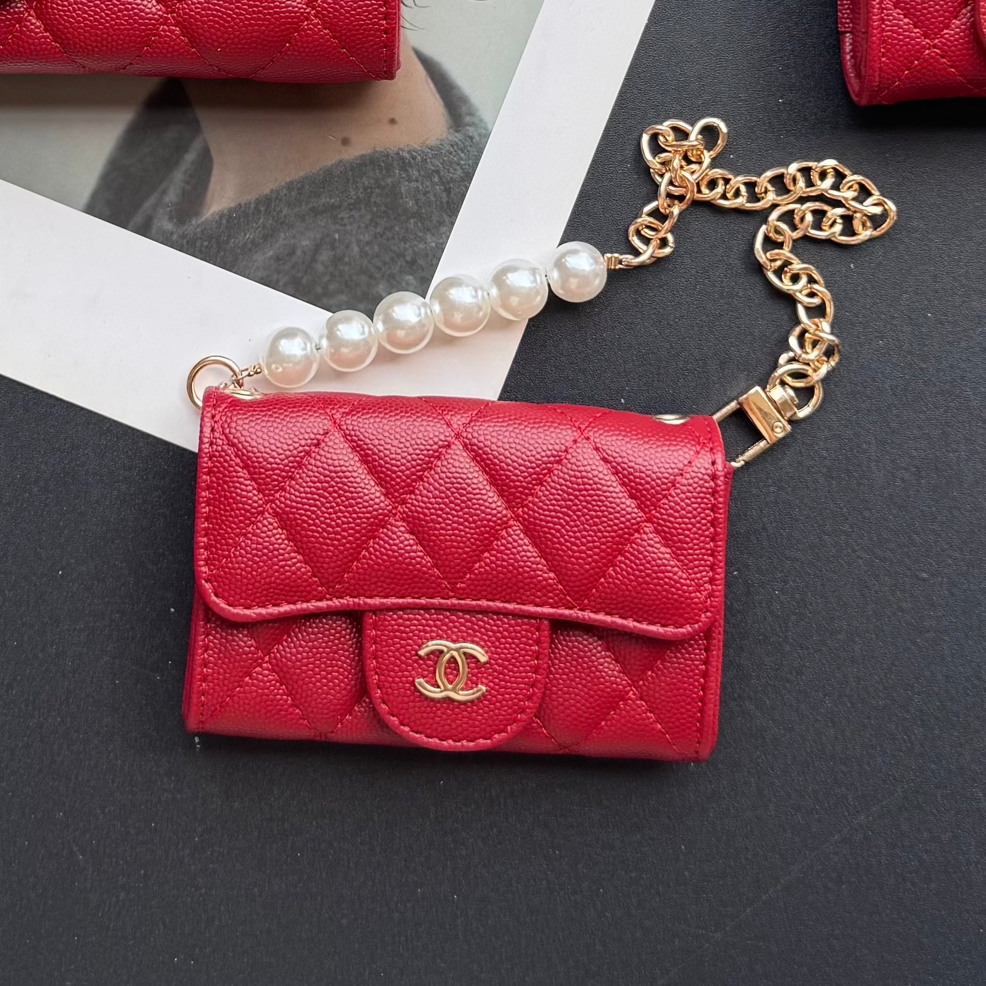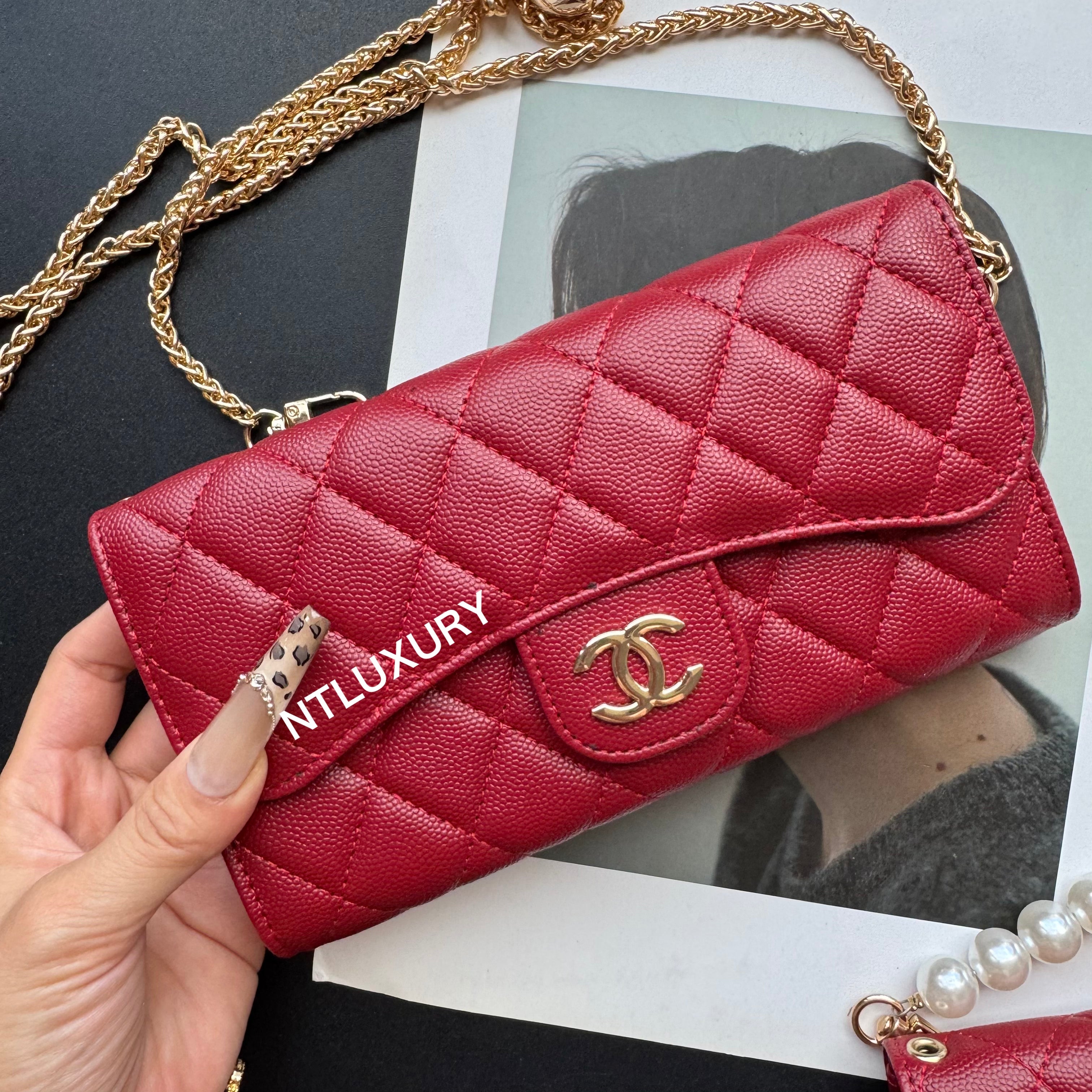 With dimensions of 115mm x 72mm, the medium bag features an elegant short chain adorned with a pearl, adding a touch of sophistication. It functions ideally as a compact card holder, conveniently storing cards, IDs, and even some small accessories. Its chic design makes it suitable for both casual and formal occasions.