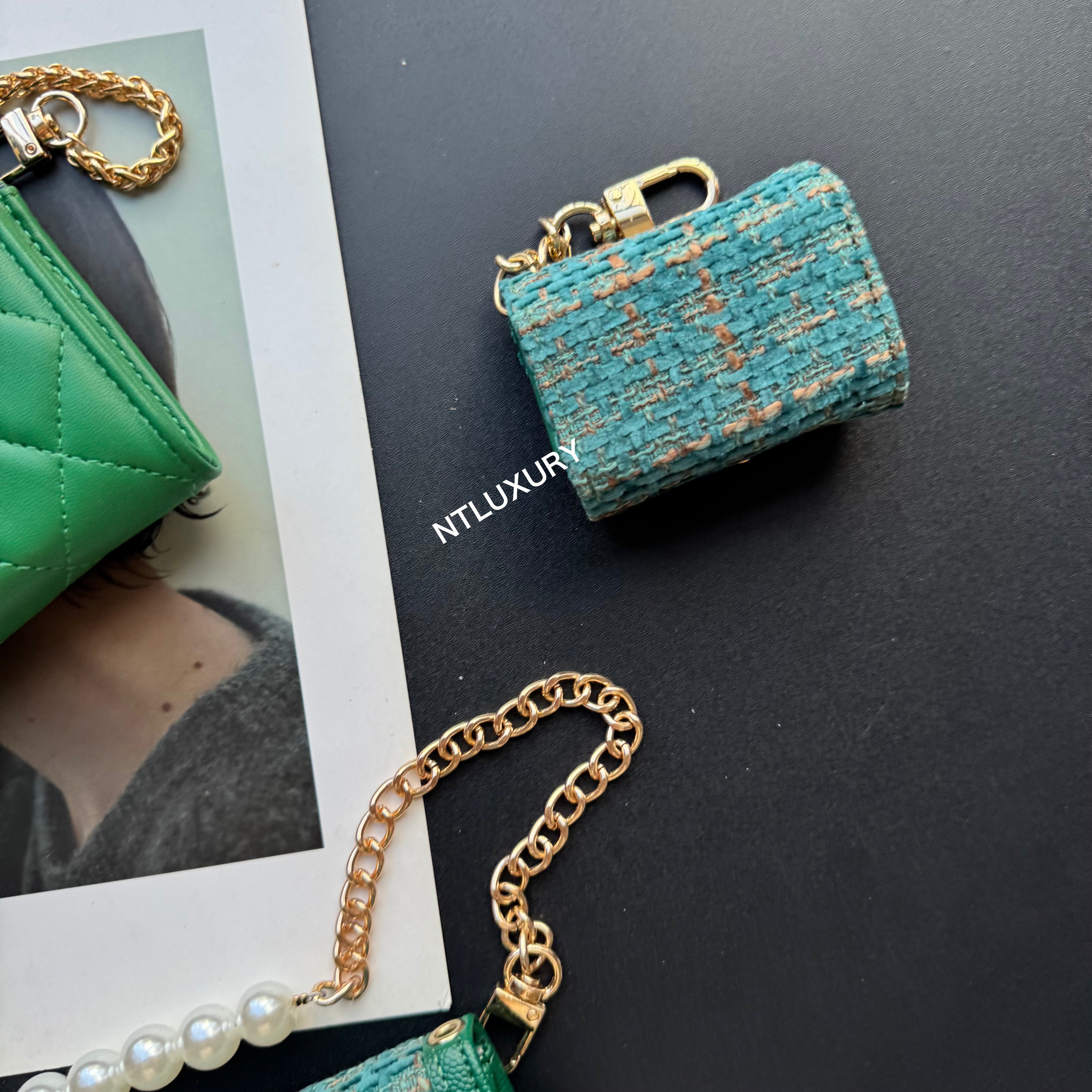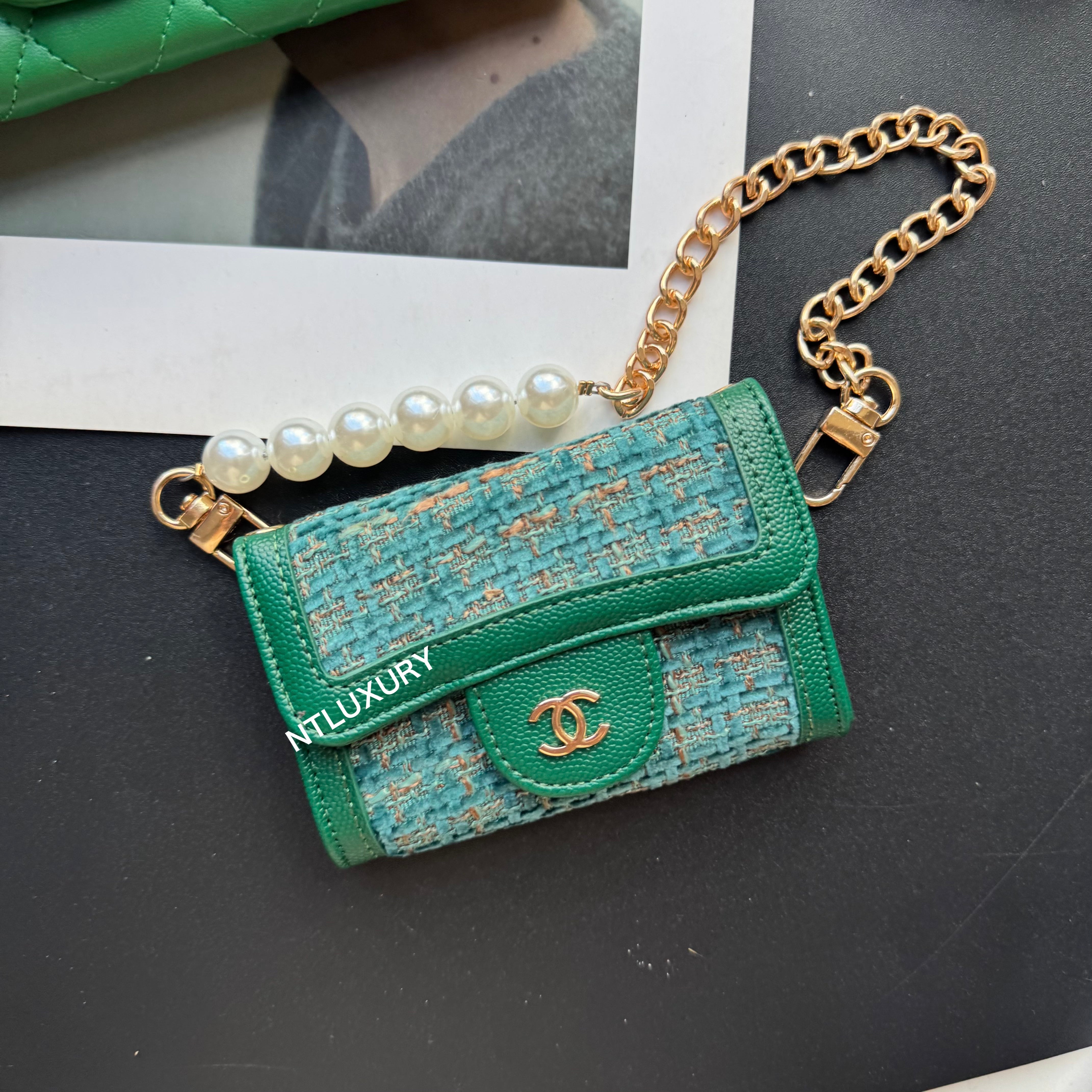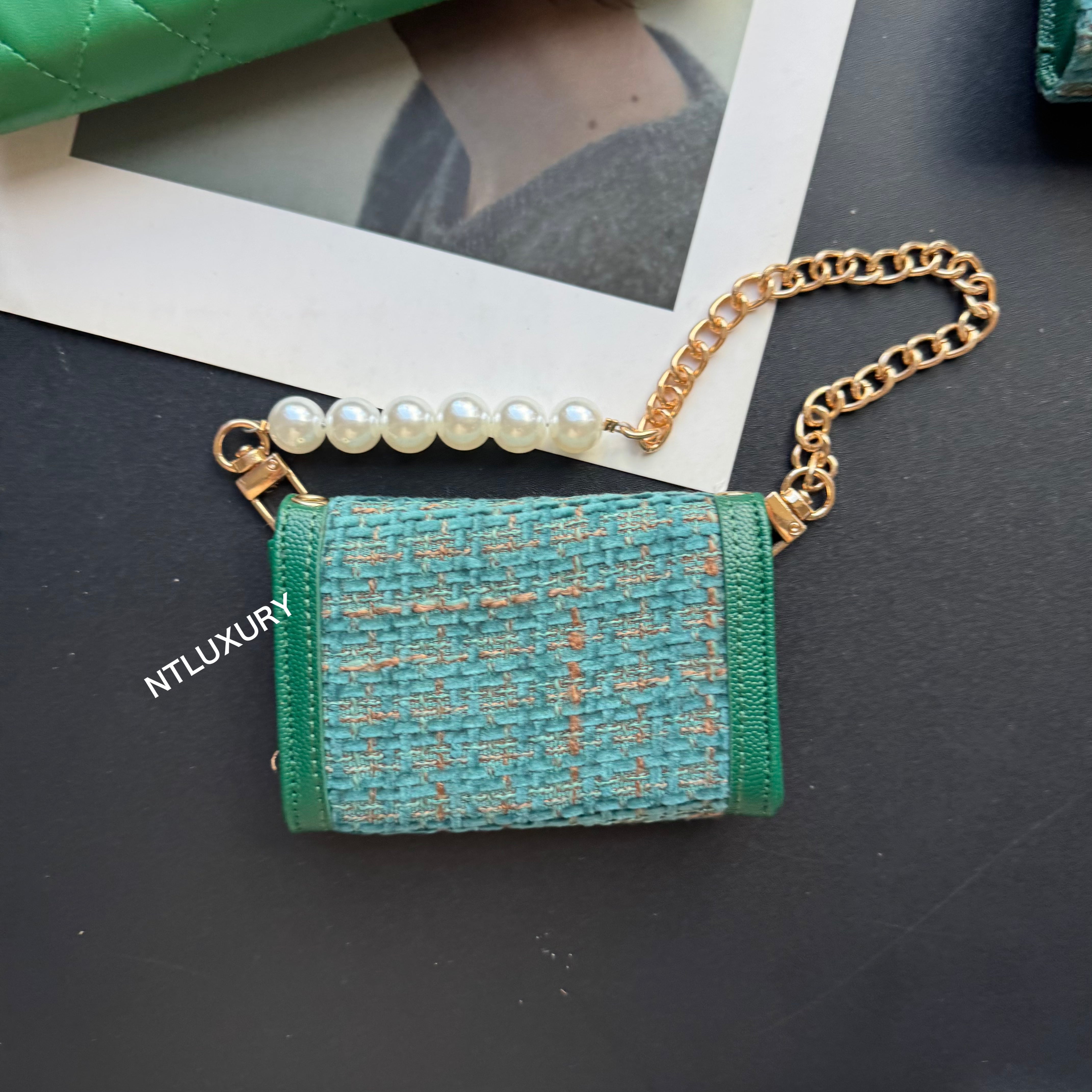 With dimensions of 115mm x 72mm, the medium bag features an elegant short chain adorned with a pearl, adding a touch of sophistication. It functions ideally as a compact card holder, conveniently storing cards, IDs, and even some small accessories. Its chic design makes it suitable for both casual and formal occasions.