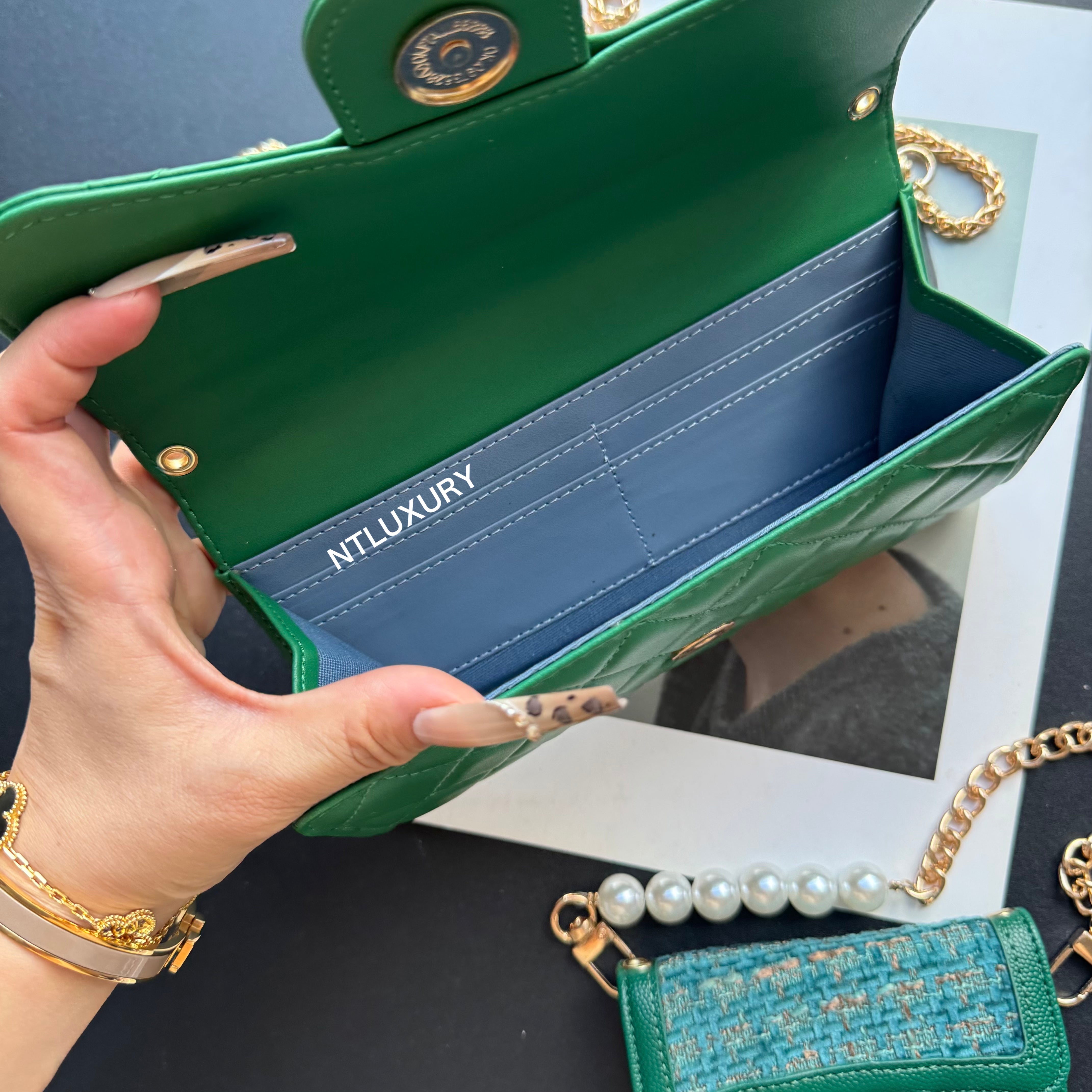 Measuring 190mm x 105mm, the large bag comes with an adjustable long chain strap, making it versatile for both handheld and shoulder carry. Its spacious interior is perfectly sized to hold a smartphone, multiple cards, a lipstick, and other daily essentials, offering both practicality and style for everyday use.