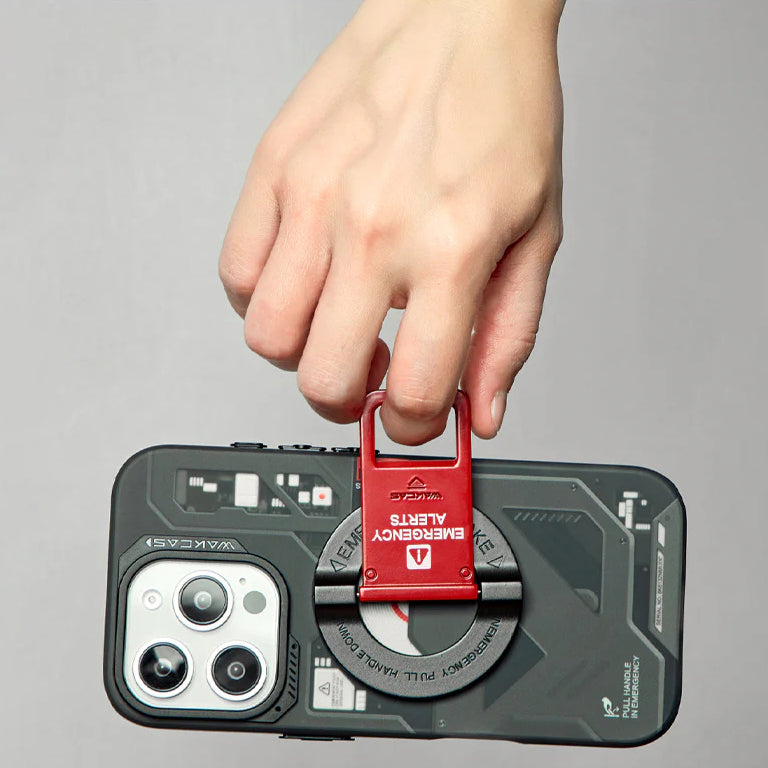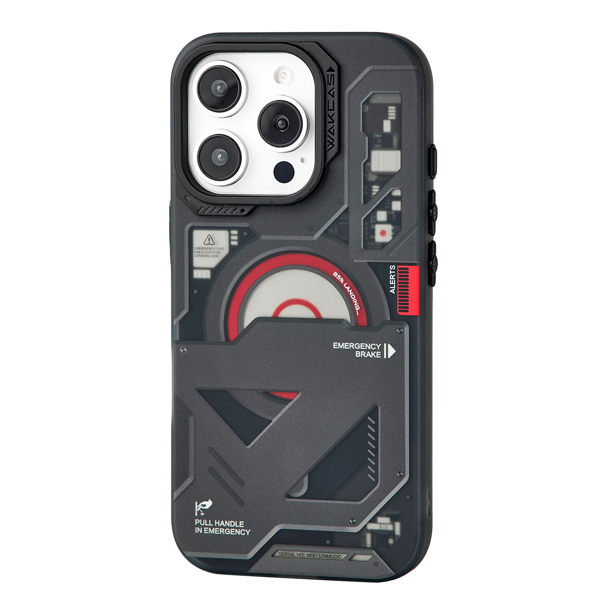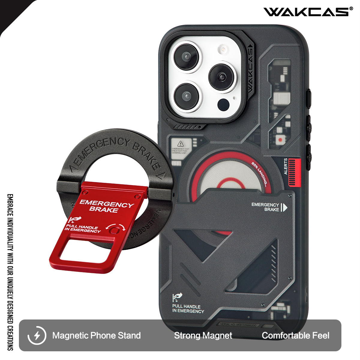 The Wakcas Black Emergency Panel iPhone Case offers a sophisticated matte black finish with a unique emergency panel design. This magnetic protective case delivers premium protection while maintaining a minimalist, professional aesthetic.
